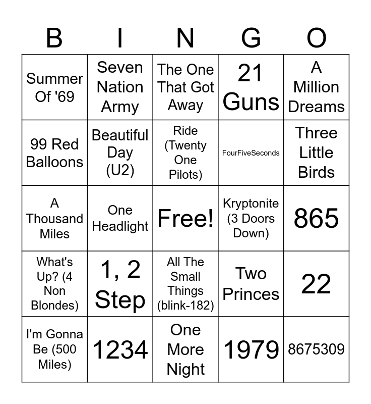 This bingo card has a free space and 71 words: Mambo No. 5, Seven Nation Army, 9 to 5, 24K Magic, One More Night, 4 Minutes, 21 Guns, 1999, FourFiveSeconds, Like A G6, I'm Gonna Be (500 Miles), 3:00 AM, Three Little Birds, Summer Of '69, 7 Years, A Thousand Miles, Two Princes, A Million Dreams, One Week, 865, 1, 2 Step, 8675309, 22, Edge of Seventeen, Another One Bites The Dust, ...Baby One More Time, It Takes Two, One Way Or Another, Sk8er Boi, Song 2, 1234, 10,000 Hours, 7 rings, One Love, 1979, One, Just The Two Of Us, Just the Two of Us, 99 Red Balloons, Red Red Wine, All The Small Things (blink-182), I Can't Help Myself (four tops), What's Up? (4 Non Blondes), Love Shack (The B-52's), Blue (Eiffel 65), Work from Home (Fifth Harmony), Youngblood (5 Seconds of Summer), Beautiful Day (U2), Moves Like Jagger (Maroon 5), I Ain't Worried (OneRepublic), 2 Legit 2 Quit, Inside Out (Eve 6), Kryptonite (3 Doors Down), Story of My Life (OneDirection), What Makes You Beautiful (OneDirection), Stressed Out (Twenty One Pilots), Ride (Twenty One Pilots), One Margarita, One Man Band, One More Time, One Thing Right, One Step Closer, One Headlight, One Call Away, One Step At a Time, One Of Them Girls, The One That Got Away, One Sweet Day, The One I Love, Counting Stars and Gimme Three Steps.