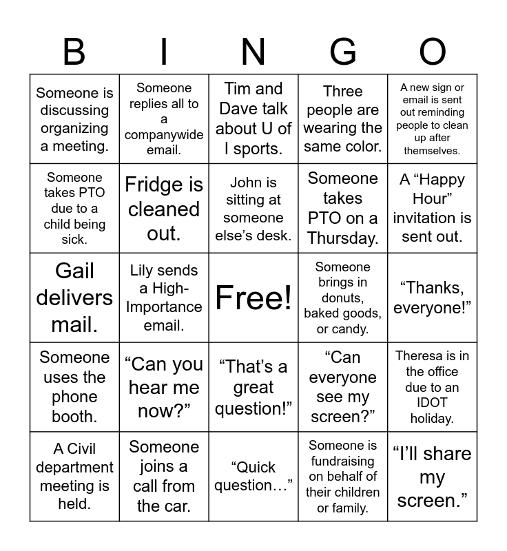 This bingo card has 1 images, a free space and 33 words: Beer Man comes around. Lily sends a High-Importance email. Gail asks someone to take photos. Someone uses the phone booth. Fridge is cleaned out. A new sign or email is sent out reminding people to clean up after themselves. A Civil department meeti, Beer Man comes around., Lily sends a High-Importance email., Gail asks someone to take photos., Someone uses the phone booth., Fridge is cleaned out., A new sign or email is sent out reminding people to clean up after themselves., A Civil department meeting is held., Someone replies all to a companywide email., Gail turns on or off the baseboard heater., John is sitting at someone else’s desk., Tim and Dave talk about U of I sports., “You’re on mute.”, IT sends a fake phishing attempt/campaign., Someone brings in donuts, baked goods, or candy., A “Happy Hour” invitation is sent out., Someone joins a call from the car., Gail delivers mail., “Can you hear me now?”, “Can everyone see my screen?”, “That’s a great question!”, Someone is discussing a BD pursuit., Someone is discussing organizing a meeting., “Thanks, everyone!”, “Quick question…”, “I’ll share my screen.”, Three people are wearing the same color., Someone takes PTO on a Thursday., Someone takes PTO due to a child being sick., Theresa is in the office due to an IDOT holiday., Someone’s cell phone ringer goes off., Someone is fundraising on behalf of their children or family. and “Did you have a good weekend?”.