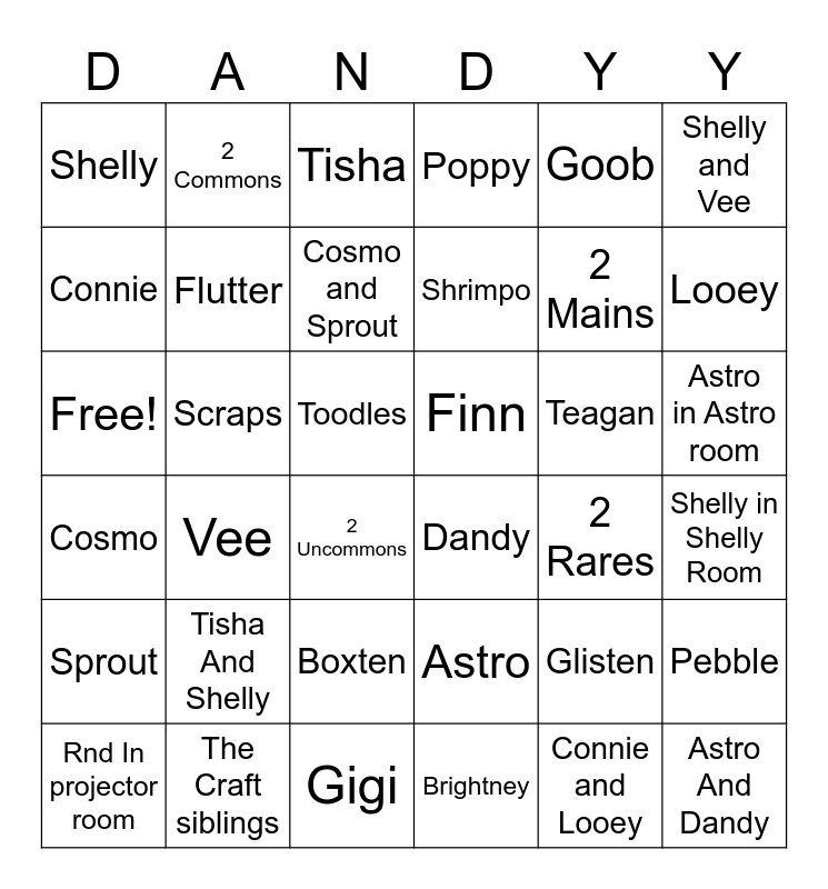 This bingo card has 36 words: Astro, Boxten, Brightney, Connie, Cosmo, Finn, Flutter, Gigi, Goob, Glisten, Looey, Poppy, Pebble, Scraps, Shrimpo, Shelly, Sprout, Teagan, Free!, Tisha, Toodles, Vee, Dandy, 2 Uncommons, 2 Rares, 2 Commons, 2 Mains, The Craft siblings, Cosmo and Sprout, Shelly and Vee, Astro And Dandy, Rnd In projector room, Shelly in Shelly Room, Astro in Astro room, Tisha And Shelly and Connie and Looey.