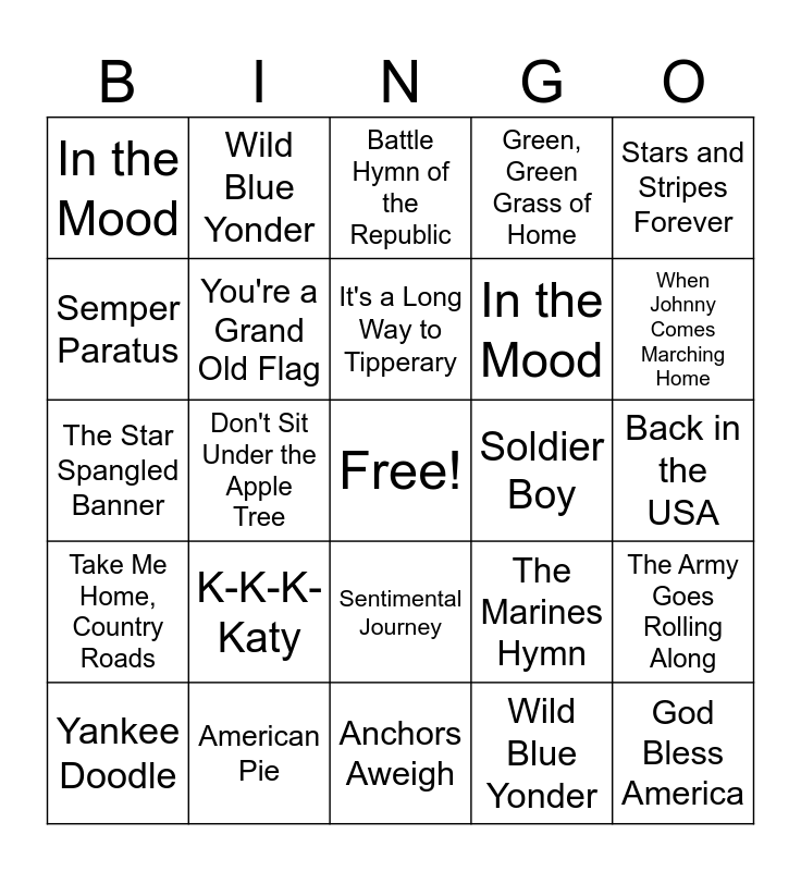 This bingo card has a free space and 33 words: America the Beautiful, We'll Meet Again, Don't Sit Under the Apple Tree, My Country ! Tis of Thee, Take Me Home, Country Roads, You're a Grand Old Flag, Stars and Stripes Forever, Yankee Doodle, Wild Blue Yonder, Boogie Woogie Bugle Boy, It's a Long Way to Tipperary, Battle Hymn of the Republic, God Bless the USA, This Land is Your Land, Soldier Boy, When Johnny Comes Marching Home, American Pie, The Star Spangled Banner, K-K-K- Katy, The Marines Hymn, Sentimental Journey, When The Lights Go On Again, In the Mood, Back in the USA, Anchors Aweigh, God Bless America, Green, Green Grass of Home, In the Mood, Semper Paratus, The Army Goes Rolling Along, White Cliffs of Dover, Wild Blue Yonder and Yankee Doodle Boy.
