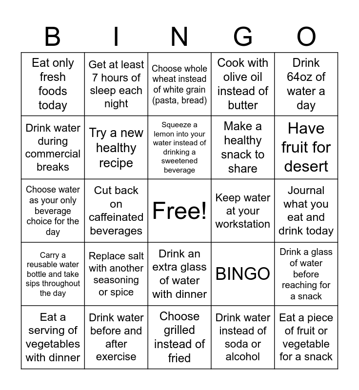 This bingo card has a free space and 25 words: Replace salt with another seasoning or spice, Choose grilled instead of fried, Squeeze a lemon into your water instead of drinking a sweetened beverage, Eat a serving of vegetables with dinner, Drink 64oz of water a day, Eat only fresh foods today, Drink water during commercial breaks, Get at least 7 hours of sleep each night, Keep water at your workstation, Drink an extra glass of water with dinner, Make a healthy snack to share, Choose water as your only beverage choice for the day, BINGO, Drink a glass of water before reaching for a snack, Try a new healthy recipe, Drink 100% juice instead of fruit flavored drinks, Journal what you eat and drink today, Choose whole wheat instead of white grain (pasta, bread), Have fruit for desert, Cut back on caffeinated beverages, Eat a piece of fruit or vegetable for a snack, Drink water before and after exercise, Carry a reusable water bottle and take sips throughout the day, Cook with olive oil instead of butter and Drink water instead of soda or alcohol.