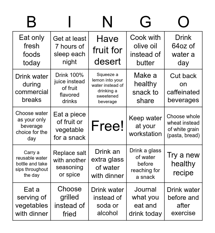 This bingo card has a free space and 24 words: Replace salt with another seasoning or spice, Choose grilled instead of fried, Squeeze a lemon into your water instead of drinking a sweetened beverage, Eat a serving of vegetables with dinner, Drink 64oz of water a day, Eat only fresh foods today, Drink water during commercial breaks, Get at least 7 hours of sleep each night, Keep water at your workstation, Drink an extra glass of water with dinner, Make a healthy snack to share, Choose water as your only beverage choice for the day, Drink a glass of water before reaching for a snack, Try a new healthy recipe, Drink 100% juice instead of fruit flavored drinks, Journal what you eat and drink today, Choose whole wheat instead of white grain (pasta, bread), Have fruit for desert, Cut back on caffeinated beverages, Eat a piece of fruit or vegetable for a snack, Drink water before and after exercise, Carry a reusable water bottle and take sips throughout the day, Cook with olive oil instead of butter and Drink water instead of soda or alcohol.