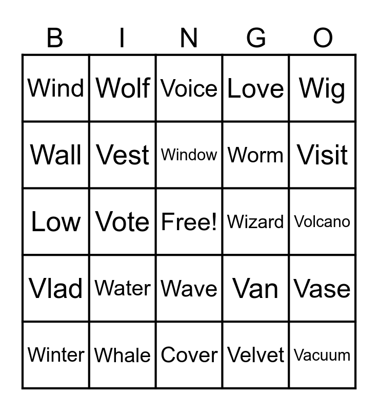 This bingo card has a free space and 24 words: Water, Whale, Window, Winter, Wig, Wind, Wall, Wolf, Wizard, Wave, Worm, Low, Van, Vase, Vest, Velvet, Volcano, Voice, Visit, Vote, Vacuum, Vlad, Love and Cover.