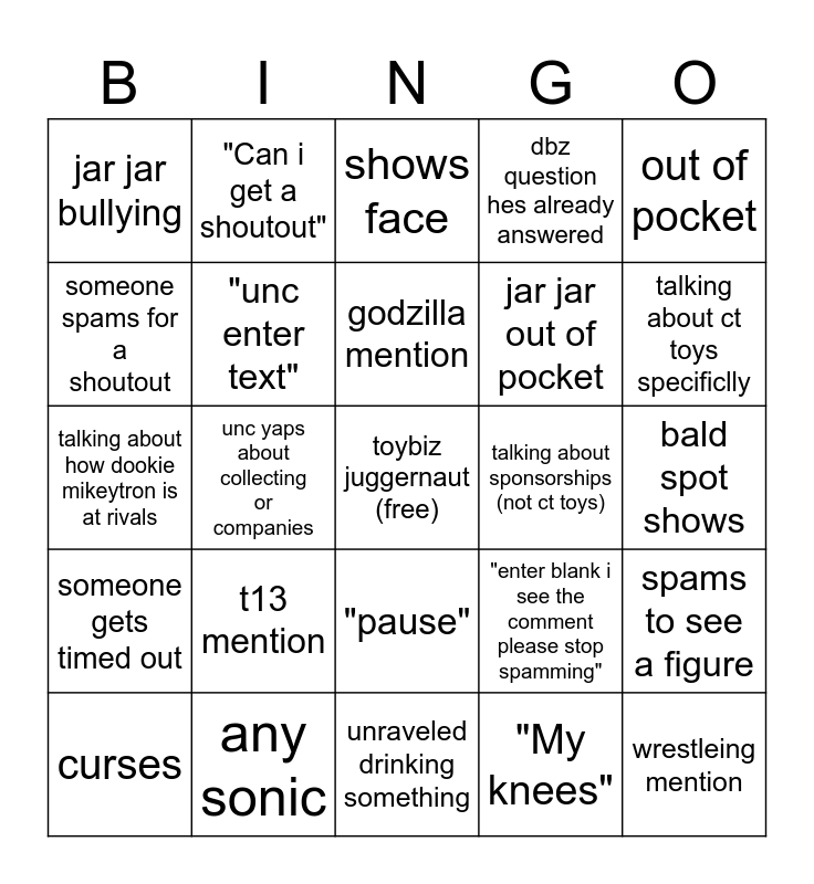 This bingo card has a free space and 24 words: t13 mention, any sonic, godzilla mention, curses, out of pocket, jar jar bullying, someone spams for a shoutout, "Can i get a shoutout", talking about sponsorships (not ct toys), "pause", jar jar out of pocket, talking about how dookie mikeytron is at rivals, "enter blank i see the comment please stop spamming", spams to see a figure, "unc enter text", "My knees", bald spot shows, shows face, talking about ct toys specificlly, unc yaps about collecting or companies, wrestleing mention, someone gets timed out, dbz question hes already answered and unraveled drinking something.