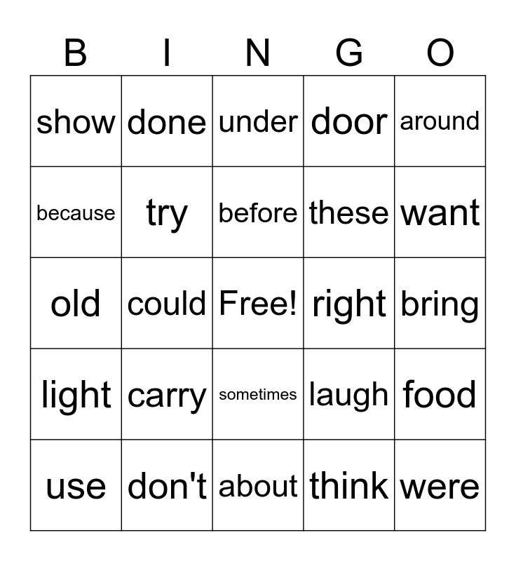 This bingo card has a free space and 24 words: carry, don't, before, use, around, show, because, done, right, sometimes, these, old, laugh, food, try, think, bring, under, want, could, were, light, door and about.