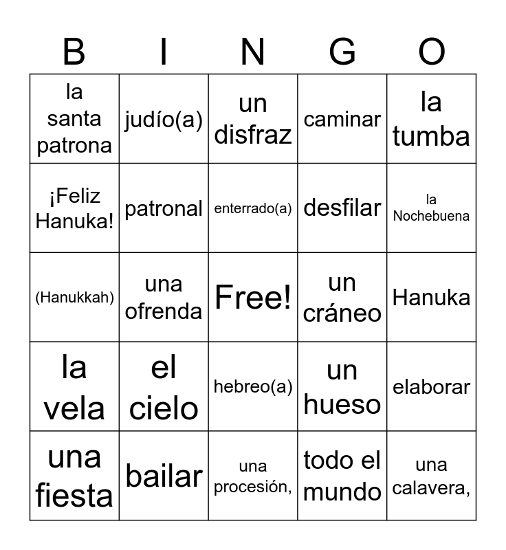 This bingo card has a free space and 57 words: una feria, una fiesta, el santo patrón, la santa patrona, una procesión,, un desfile, patronal, patron saint, desfilar, or procession), caminar, los muertos,, los difuntos, el camposanto,, el cementerio, el mausoleo, la tumba, una ofrenda, una corona de flores, una calavera,, un cráneo, un esqueleto, un hueso, un disfraz, una máscara, enterrado(a), la Navidad,, las Navidades, la Nochebuena, la chimenea, un aguinaldo, la paja, el árbol de Navidad, decorar, Hanuka, ¡Feliz Hanuka!, la fiesta de las luces, (Hanukkah), la menora, la vela, judío(a), hebreo(a), encender, un desfile, una banda municipal, los fuegos artificiales, el cielo, bailar, iluminar, to illuminate, el bizcocho, todo el mundo, dulce, celebrar, confeccionar, elaborar and mientras.