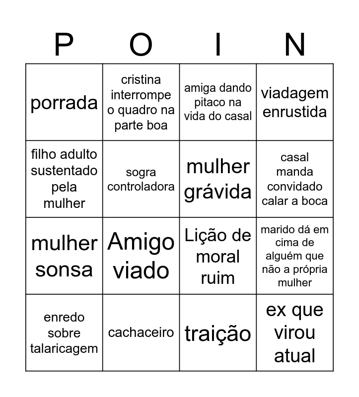 This bingo card has 16 words: cachaceiro, marido dá em cima de alguém que não a própria mulher, amiga dando pitaco na vida do casal, porrada, mulher sonsa, cristina interrompe o quadro na parte boa, Lição de moral ruim, traição, filho adulto sustentado pela mulher, sogra controladora, enredo sobre talaricagem, viadagem enrustida, Amigo viado, casal manda convidado calar a boca, mulher grávida and ex que virou atual.