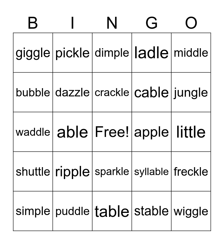 This bingo card has a free space and 24 words: simple, ripple, crackle, stable, middle, giggle, pickle, dimple, apple, little, waddle, dazzle, syllable, freckle, bubble, puddle, table, ladle, jungle, shuttle, able, sparkle, cable and wiggle.