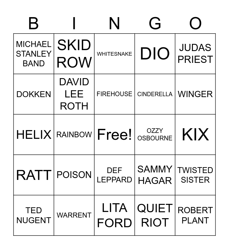 This bingo card has a free space and 35 words: AUTOGRAPH, BRITNY FOX, BULLET BOYS, DAVID LEE ROTH, DEF LEPPARD, DIO, DOKKEN, FASTER PUSSYCAT, FIREHOUSE, GREAT WHITE, HELIX, JUDAS PRIEST, LYNCH MOB, MOTLEY CRUE, MICHAEL STANLEY BAND, OZZY OSBOURNE, QUIET RIOT, RAINBOW, RATT, ROBERT PLANT, SAMMY HAGAR, TED NUGENT, TWISTED SISTER, WARRENT, WHITESNAKE, WINGER, BON JOVI, CHILDS PLAY, CINDERELLA, KIX, LA GUNS, LITA FORD, POISON, SKID ROW and VIXEN.