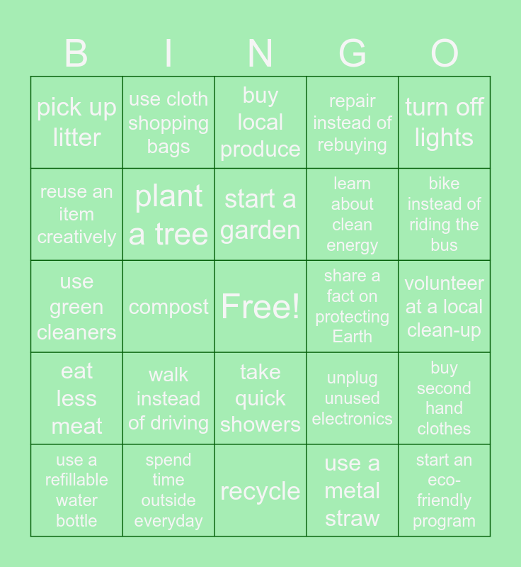 This bingo card has a free space and 24 words: walk instead of driving, spend time outside everyday, start a garden, use a refillable water bottle, turn off lights, pick up litter, reuse an item creatively, use cloth shopping bags, share a fact on protecting Earth, take quick showers, learn about clean energy, use green cleaners, unplug unused electronics, buy second hand clothes, plant a tree, use a metal straw, volunteer at a local clean-up, buy local produce, bike instead of riding the bus, compost, start an eco-friendly program, eat less meat, repair instead of rebuying and recycle.