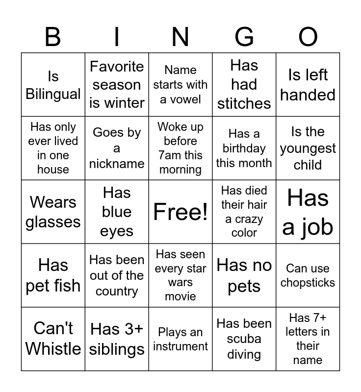 This bingo card has a free space and 24 words: Has been out of the country, Has 3+ siblings, Woke up before 7am this morning, Can't Whistle, Is left handed, Is Bilingual, Has only ever lived in one house, Favorite season is winter, Has died their hair a crazy color, Has seen every star wars movie, Has a birthday this month, Wears glasses, Has no pets, Can use chopsticks, Goes by a nickname, Has been scuba diving, Has a job, Name starts with a vowel, Is the youngest child, Has blue eyes, Has 7+ letters in their name, Has pet fish, Has had stitches and Plays an instrument.