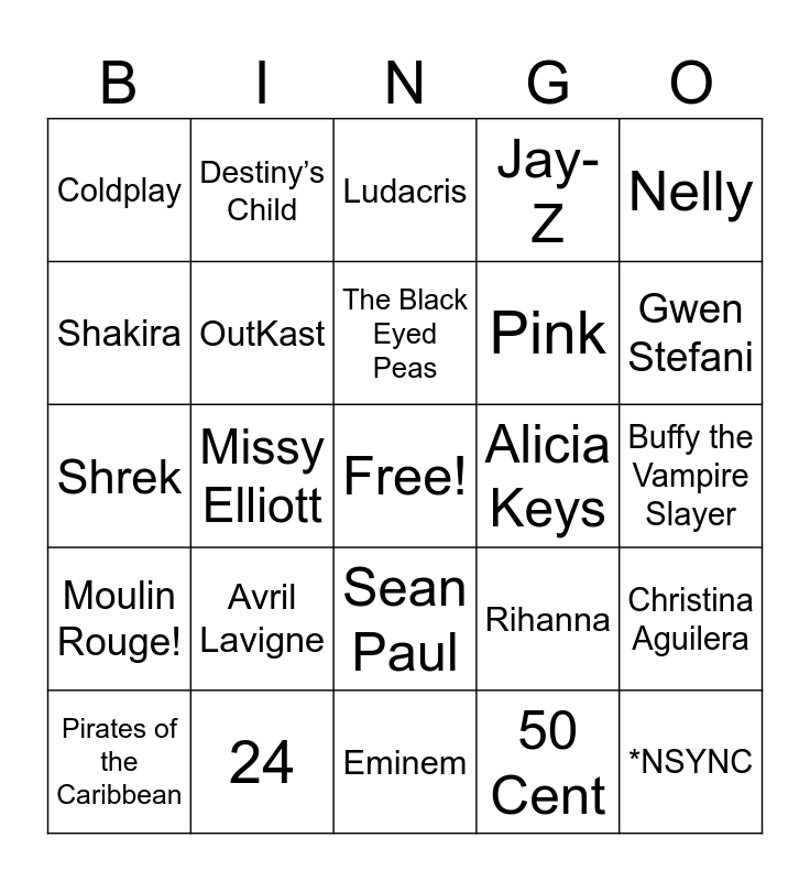 This bingo card has a free space and 50 words: Beyoncé, *NSYNC, Britney Spears, Eminem, Avril Lavigne, Justin Timberlake, Destiny’s Child, Usher, Shakira, Kelly Clarkson, OutKast, Jay-Z, Christina Aguilera, Rihanna, Green Day, Linkin Park, The Black Eyed Peas, Alicia Keys, Maroon 5, Nelly, Missy Elliott, 50 Cent, Coldplay, Pink, Jennifer Lopez, Kanye West, Gwen Stefani, Ashanti, Ludacris, Sean Paul, Friends, The Sopranos, The Office, Lost, 24, Gilmore Girls, Grey’s Anatomy, The West Wing, Arrested Development, Buffy the Vampire Slayer, The Lord of the Rings Trilogy, Harry Potter Series, Spider-Man, The Dark Knight, Pirates of the Caribbean, Shrek, Finding Nemo, Gladiator, Moulin Rouge! and The Incredibles.