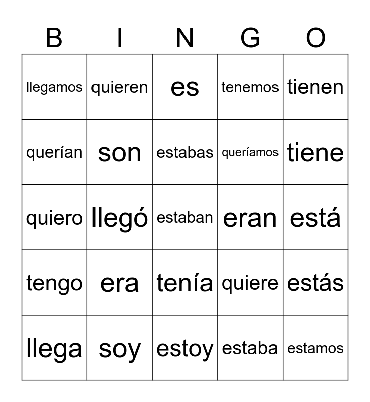 This bingo card has a free space and 29 words: llega, llego, llegó, llegaron, llegamos, es, son, era, eran, soy, está, estamos, estoy, estaba, tiene, tenían, tenía, tengo, tienen, quiero, quiere, quería, queríamos, querían, tenemos, quieren, estás, estabas and eres.