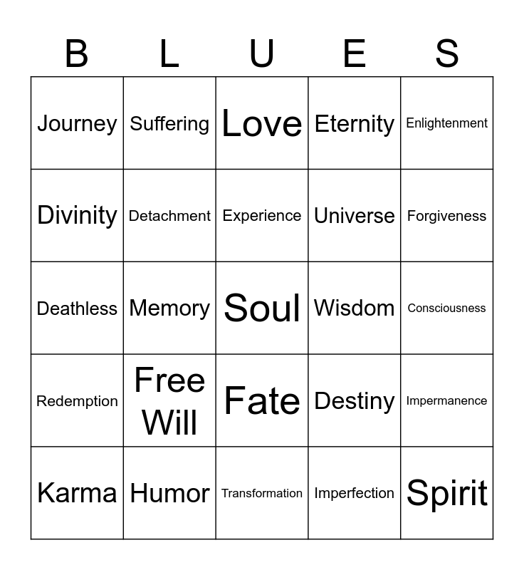 This bingo card has 44 words: Reincarnation, Soul, Death, Karma, Afterlife, Imperfection, Love, Purpose, Enlightenment, Humor, Eternity, Wisdom, Fate, Free Will, Self-Discovery, Transformation, Lives, Deathless, Meditation, Forgiveness, Suffering, Growth, Choices, Journey, Connection, Consciousness, Reflection, Identity, Destiny, Redemption, Rebirth, Impermanence, Compassion, Evolution, Memory, Transcendence, Acceptance, Spirit, Experience, Divinity, Universe, Free Spirit, Detachment and Enlightened.