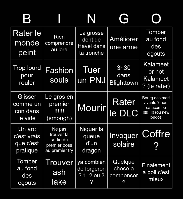 This bingo card has a free space and 24 words: Ne pas trouver la sortie du premier boss au premier try, Trouver ash lake, Tuer un PNJ, Tomber au fond des égouts, Tomber au fond des égouts, Rater le monde peint, Trop lourd pour rouler, Rien comprendre au lore, Rater le DLC, Niquer la queue d'un dragon, 3h30 dans Blighttown, Glisser comme un con dans le vide, Invoquer solaire, Coffre ?, Fashion souls, Quelque chose a compenser ?, Bourg des mort vivants ? non, catacombe !!!!!!!!!! (ou new londo)), La grosse dent de Havel dans ta tronche, Kalameet or not Kalameet ? (le rater), Le gros en premier !!!!!! (smough), Finalement a poil c'est mieux, Un arc c'est vrais que c'est pratique, Améliorer une arme and ya combien de forgeron ? 1, 2 ou 3 ?.