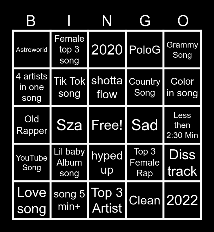 This bingo card has a free space and 24 words: Lil baby Album song, song 5 min+, shotta flow, Love song, Grammy Song, Astroworld, 4 artists in one song, Female top 3 song, Sad, hyped up, Country Song, Old Rapper, Top 3 Female Rap, Diss track, Tik Tok song, Clean, Less then 2:30 Min, 2020, Color in song, Sza, 2022, YouTube Song, PoloG and Top 3 Artist.