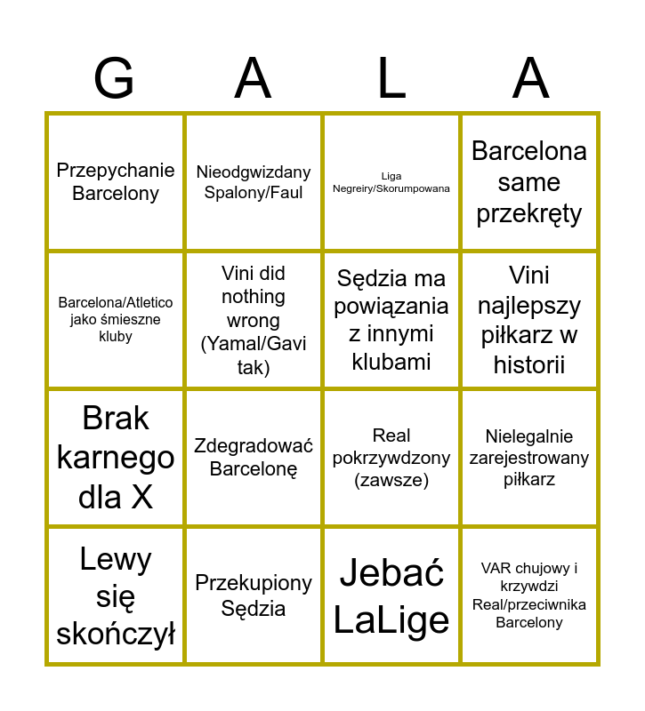 This bingo card has 16 words: Przekupiony Sędzia, Nielegalnie zarejestrowany piłkarz, Liga Negreiry/Skorumpowana, Przepychanie Barcelony, Brak karnego dla X, Nieodgwizdany Spalony/Faul, Real pokrzywdzony (zawsze), Jebać LaLige, Barcelona/Atletico jako śmieszne kluby, Vini did nothing wrong (Yamal/Gavi tak), Lewy się skończył, Barcelona same przekręty, Zdegradować Barcelonę, Vini najlepszy piłkarz w historii, Sędzia ma powiązania z innymi klubami and VAR chujowy i krzywdzi Real/przeciwnika Barcelony.