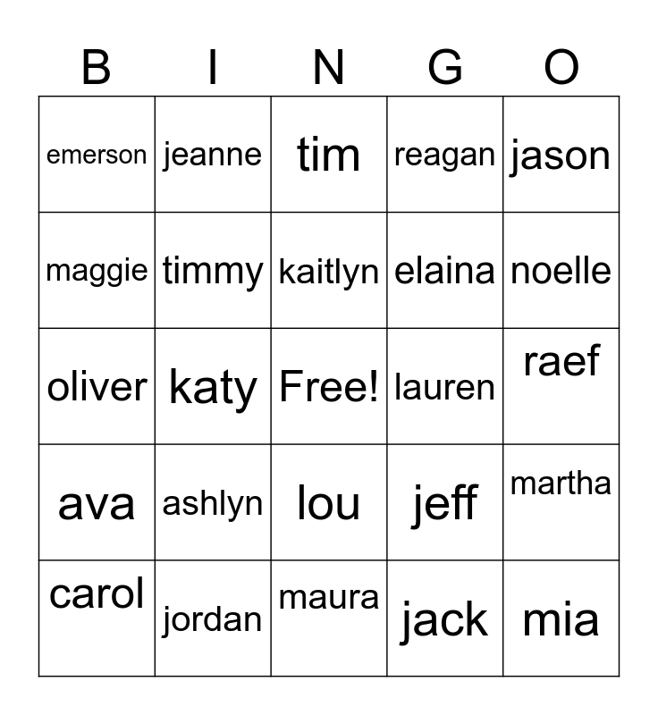 This bingo card has a free space and 24 words: carol, ashlyn, kaitlyn, jack, jason, emerson, jeanne, tim, lauren, raef, oliver, timmy, jeff, martha, maggie, jordan, maura, reagan, noelle, ava, katy, lou, elaina and mia.