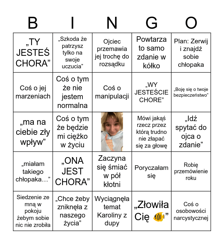 This bingo card has a free space and 24 words: „ONA JEST CHORA”, „Chce żeby zniknęła z naszego życia”, Coś o manipulacji, Siedzenie ze mną w pokoju żebym sobie nic nie zrobiła, Plan: Zerwij i znajdź sobie chłopaka, „TY JESTEŚ CHORA”, Coś o jej marzeniach, „Szkoda że patrzysz tylko na swoje uczucia”, Mówi jakąś rzecz przez którą trudno nie złapać się za głowę, Zaczyna się śmiać w pół kłotni, „WY JESTEŚCIE CHORE”, „ma na ciebie zły wpływ”, Poryczałam się, Robię przemówienie roku, Coś o tym że nie jestem normalna, „Złowiła Cię 🐠”, „Idź spytać do ojca o zdanie”, Ojciec przemawia jej trochę do rozsądku, „Boję się o twoje bezpieczeństwo”, Coś o tym że będzie mi ciężko w życiu, Coś o osobowości narcystycznej, „miałam takiego chłopaka…”, Powtarza to samo zdanie w kółko and Wyciągnęła temat Karoliny z dupy.