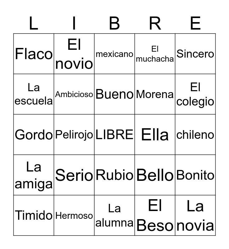 This bingo card has a free space and 24 words: Serio, Hermoso, Bueno, Timido, Sincero, Flaco, La escuela, El novio, Ella, Rubio, Morena, Gordo, Bello, Bonito, Ambicioso, El Beso, chileno, mexicano, El colegio, Pelirojo, La novia, La amiga, El muchacha and La alumna.