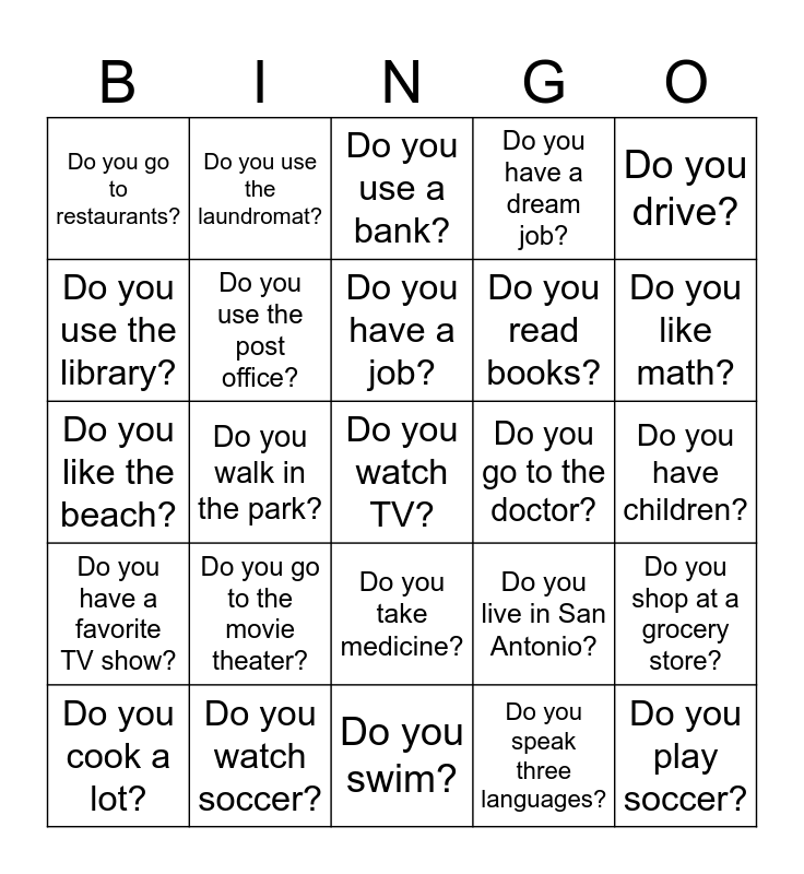 This bingo card has 25 words: Do you go to the movie theater?, Do you swim?, Do you have a job?, Do you cook a lot?, Do you drive?, Do you go to restaurants?, Do you use the library?, Do you use the laundromat?, Do you go to the doctor?, Do you take medicine?, Do you read books?, Do you like the beach?, Do you live in San Antonio?, Do you shop at a grocery store?, Do you use the post office?, Do you play soccer?, Do you have children?, Do you use a bank?, Do you like math?, Do you walk in the park?, Do you watch TV?, Do you watch soccer?, Do you have a favorite TV show?, Do you have a dream job? and Do you speak three languages?.