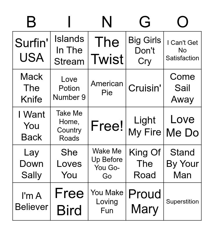 This bingo card has a free space and 79 words: It's Now Or Never, El Paso, The Twist, I'm Sorry, Only The Lonely, Save The Last Dance For Me, Beyond The Sea, Georgia On My Mind, Travelin' Man, Hit The Road Jack, Stand By Me, Runaround Sue, Big Girls Don't Cry, Surfin' USA, It's My Party, Mack The Knife, Return To Sender, She Loves You, I Get Around, Love Me Do, My Girl, I Can't Get No Satisfaction, I Want You Back, American Pie, Love Potion Number 9, Let's Stay Together, The Lion Sleeps Tonight, Me And Bobby McGee, Kiss An Angel Good Mornin', Blue Bayou, Come Sail Away, Stayin' Alive, You Make Loving Fun, Lovely Day, I'm A Believer, Light My Fire, Brown Eyed Girl, I Heard It Through The Grapevine, Good Vibrations, Superstition, Maggie May, Hotel California, Bohemian Rhapsody, Respect, Let It Be, Islands In The Stream, All My Exes Live In Texas, On The Road Again, Walkin' After Midnight, Forever And Ever, Amen, Stand By Your Man, Take Me Home, Country Roads, King Of The Road, Amarillo By Morning, Ring Of Fire, Uptown Girl, Faith, So Emotional, The Way You Make Me Feel, Wake Me Up Before You Go-Go, Cruisin', Physical, Don't Stop Believin', Under Pressure, Jim Dandy, Escape (The Pina Colada Song), Rock With You, Working For The Weekend, We Belong, Lay Down Sally, Free Bird, Changes, You're No Good, Have You Ever Seen The Rain, Louie Louie, Proud Mary, Sugar, Sugar, Piece Of My Heart and All Along The Watchtower.