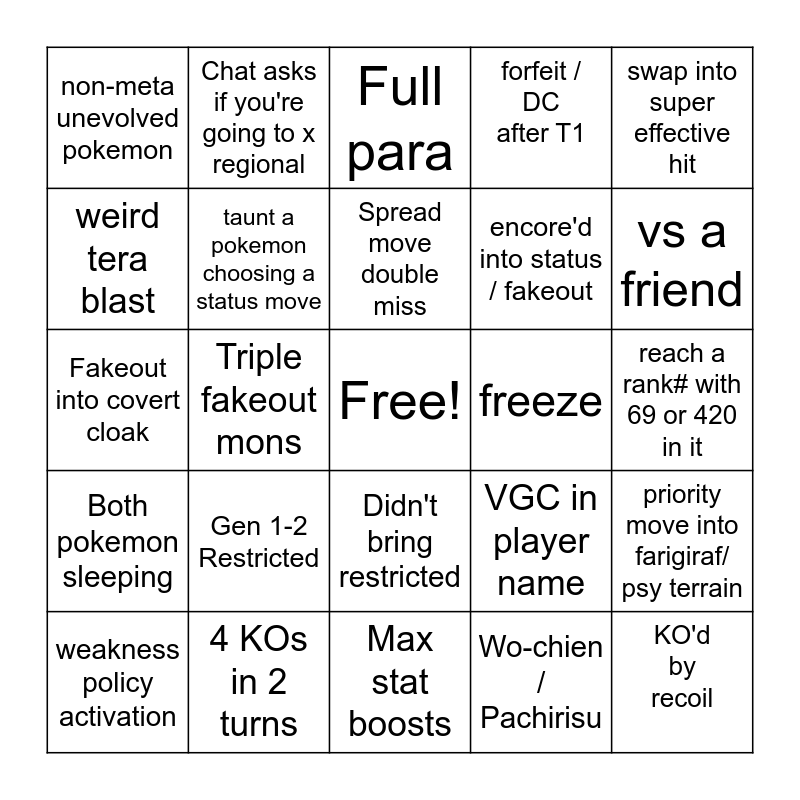 This bingo card has a free space and 38 words: double trickroom reset, double protect, crit 1hp pokemon, taunt a pokemon choosing a status move, priority move into farigiraf/ psy terrain, Gen 1-2 Restricted, Spread move double miss, Support mon gets an ohko, swap into super effective hit, encore'd into status / fakeout, Triple fakeout mons, forfeit / DC after T1, KO'd by recoil, reach a rank# with 69 or 420 in it, weird tera blast, Both pokemon sleeping, Sand team, Full para, use struggle, freeze, non-meta unevolved pokemon, 4 KOs in 2 turns, vs a friend, weakness policy activation, fire/ water/ grass pledge, Max stat boosts, Every pokemon on field KO'd, vs Worlds winning 6, gen 5 restricted, horse no rider / rider no horse, Gen 7 restricted, Didn't bring restricted, Wo-chien / Pachirisu, Chat asks if you're going to x regional, Stream snipe alligations, VGC in player name, Fakeout into covert cloak and Sucker / Thunderclap failed.
