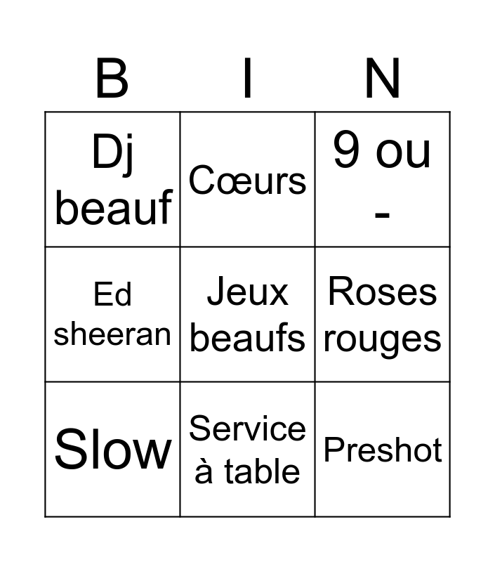 This bingo card has a free space and 8 words: Roses rouges, 9 ou -, Cœurs, Slow, Dj beauf, Preshot, Ed sheeran and Service à table.