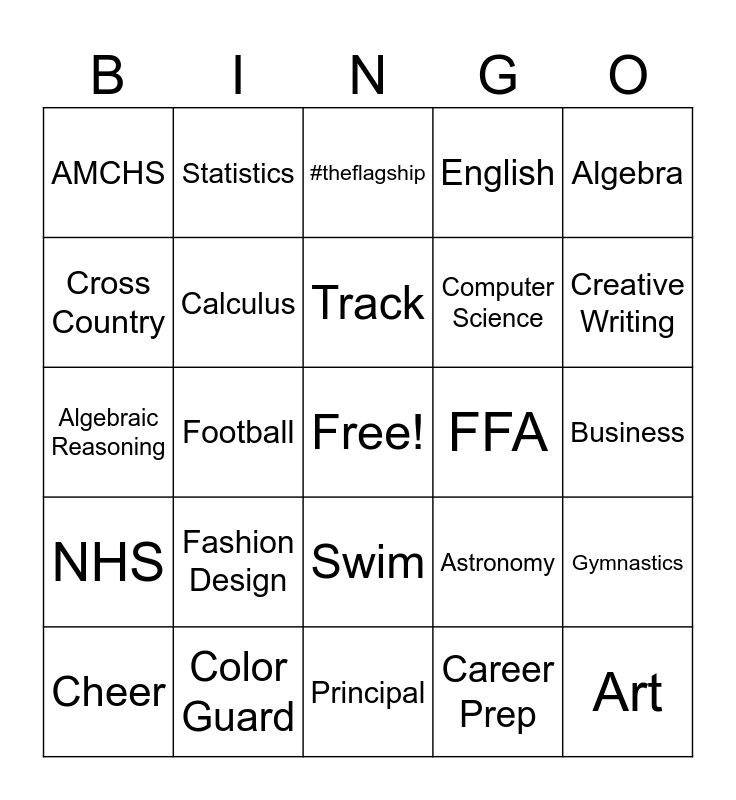 This bingo card has a free space and 75 words: Tigers, Consol, #theflagship, Soccer, Volleyball, Basketball, Baseball, Belles, Choir, Band, Orchestra, Wrestling, Track, Cross Country, Softball, Football, Theatre, Art, CTE, Algebra, Geometry, Algebraic Reasoning, Calculus, Statistics, English, World Geography, US History, Government, Economics, World History, Biology, Chemistry, Physics, Astronomy, Creative Writing, Computer Science, Graphic Design, AVP, Business, Career Prep, Tiger Cage, Assistant Principals, Counselor, Teacher, Maroon, White, Cheer, AMCHS, Excellence, Inspire, Tennis, Swim, Dive, Yearbook, The Roar, Newspaper, Speech, Debate, TigerMed, Culinary, Fashion Design, Health Science, Law Enforcement, Forensics, STUCO, FFA, Ag Mech, Floral, Robotics, Gymnastics, NHS, Color Guard, Nurses, Principal and Receptionist.