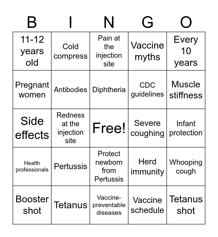 This bingo card has a free space and 24 words: Pertussis, Tetanus, Diphtheria, Booster shot, Every 10 years, 11-12 years old, Pregnant women, Cold compress, Severe coughing, Protect newborn from Pertussis, CDC guidelines, Side effects, Herd immunity, Whooping cough, Antibodies, Vaccine schedule, Infant protection, Pain at the injection site, Muscle stiffness, Redness at the injection site, Tetanus shot, Health professionals, Vaccine myths and Vaccine-preventable diseases.