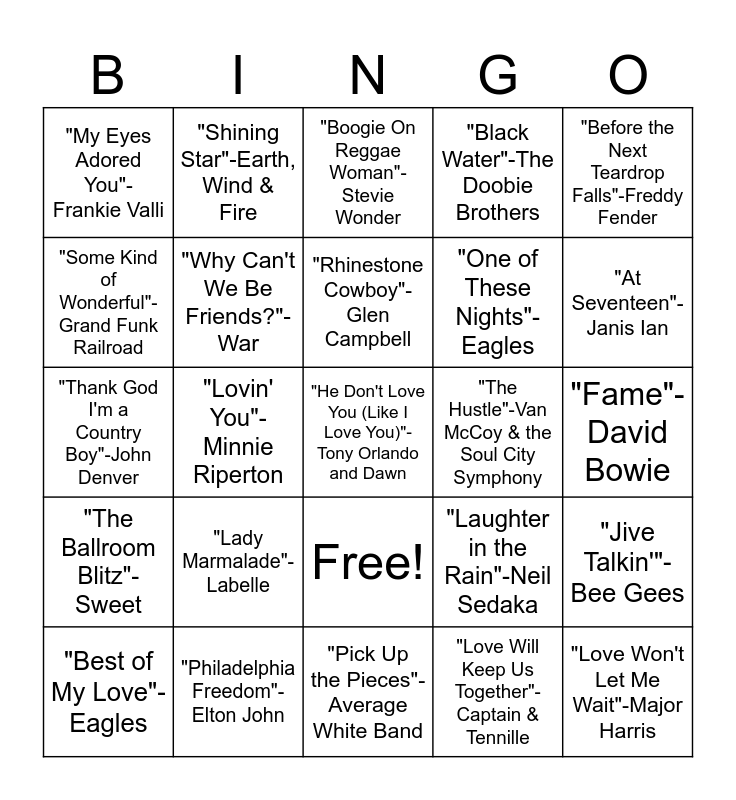 This bingo card has 26 words: Free!, "Love Will Keep Us Together"-Captain & Tennille, "Rhinestone Cowboy"-Glen Campbell, "Philadelphia Freedom"-Elton John, "Before the Next Teardrop Falls"-Freddy Fender, "My Eyes Adored You"-Frankie Valli, "Some Kind of Wonderful"-Grand Funk Railroad, "Shining Star"-Earth, Wind & Fire, "Fame"-David Bowie, "Laughter in the Rain"-Neil Sedaka, "One of These Nights"-Eagles, "Thank God I'm a Country Boy"-John Denver, "Jive Talkin'"-Bee Gees, "Best of My Love"-Eagles, "Lovin' You"-Minnie Riperton, "Kung Fu Fighting"-Carl Douglas, "Black Water"-The Doobie Brothers, "The Ballroom Blitz"-Sweet, "Boogie On Reggae Woman"-Stevie Wonder, "He Don't Love You (Like I Love You)"-Tony Orlando and Dawn, "At Seventeen"-Janis Ian, "Pick Up the Pieces"-Average White Band, "The Hustle"-Van McCoy & the Soul City Symphony, "Lady Marmalade"-Labelle, "Why Can't We Be Friends?"-War and "Love Won't Let Me Wait"-Major Harris.