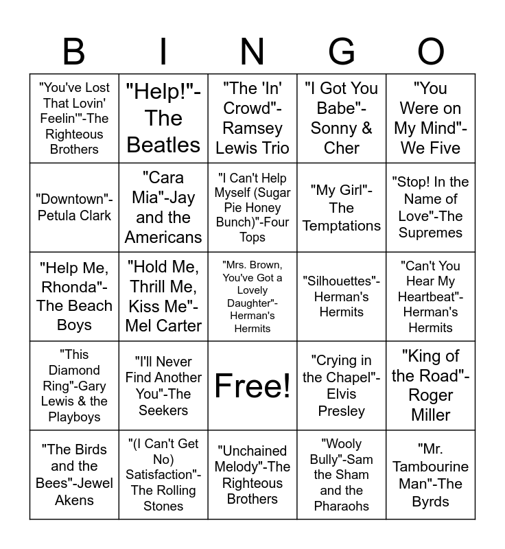 This bingo card has 26 words: Free!, "Wooly Bully"-Sam the Sham and the Pharaohs, "I Can't Help Myself (Sugar Pie Honey Bunch)"-Four Tops, "(I Can't Get No) Satisfaction"-The Rolling Stones, "You Were on My Mind"-We Five, "You've Lost That Lovin' Feelin'"-The Righteous Brothers, "Downtown"-Petula Clark, "Help!"-The Beatles, "Can't You Hear My Heartbeat"-Herman's Hermits, "Crying in the Chapel"-Elvis Presley, "My Girl"-The Temptations, "Help Me, Rhonda"-The Beach Boys, "King of the Road"-Roger Miller, "The Birds and the Bees"-Jewel Akens, "Hold Me, Thrill Me, Kiss Me"-Mel Carter, "Shotgun"-Junior Walker & the All Stars, "I Got You Babe"-Sonny & Cher, "This Diamond Ring"-Gary Lewis & the Playboys, "The 'In' Crowd"-Ramsey Lewis Trio, "Mrs. Brown, You've Got a Lovely Daughter"-Herman's Hermits, "Stop! In the Name of Love"-The Supremes, "Unchained Melody"-The Righteous Brothers, "Silhouettes"-Herman's Hermits, "I'll Never Find Another You"-The Seekers, "Cara Mia"-Jay and the Americans and "Mr. Tambourine Man"-The Byrds.
