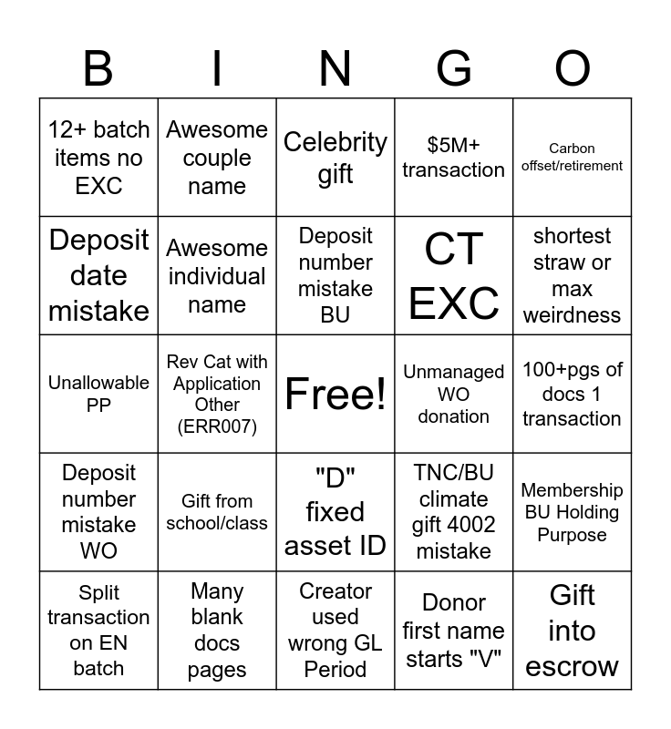 This bingo card has a free space and 76 words: Project record named for donor, 2+ pages in batch, Celebrity gift, 18+ EXC status in q, Canada batch =>$7,000CAD, 2+ tributes on single line, EN CC non-gift, Row message!, PAC Match, Fidelity wrong constituent, EXC4, H100055 should be BU Holding, Deposit number mistake BU, Deposit date mistake, Tribute to staff, Rev Cat with Application Other (ERR007), IK boat or vehicle, Gift into escrow, PayPal other method (wrong or right), Carbon offset/retirement, Unrestricted DAF/trb 4002, Unallowable PP, Awesome individual name, Awesome couple name, $5M+ transaction, $1-4.9M+ transaction, $500k-999k transaction, Mbrshp designation incorrectly changed, In-Kind Rev Cat 400200, Gift all 3 private award types, Lobbying (do not ack), Most fun fund name, Gift from staff, TNC/BU climate gift 4002 mistake, shortest straw or max weirdness, CT EXC, Batch total <$5, Fund name with animals, 100+pgs of docs 1 transaction, Donor first name starts "V", Donor first name starts "E", Books missing, Undesignated DAF 400300, Docs way out of order, 10+ items 1 batch into EXC, Typo in formal proposal, Split transaction on EN batch, 12+ batch items no EXC, UCPP, No proof of deposit, Most fun town name, "D" fixed asset ID, real estate wrong Project, EXC returned no change or comment, Solicitor credit, DAF within a DAF ex. Pittsburgh Foundation, ITG pmt no ITG docs, Recoverable grant, Designation charismatic megafauna, Handwritten child's note, Gift from school/class, Letter references missing agreement, $100k+ gift no agreement, Pay Per Action transaction, Event sponsorship, No DAF letter/details, Unmanaged WO donation, Contractual $ entered as gift, India batch has projected #, 6+ IRA 1 batch, Membership BU Holding Purpose, Deposit number mistake WO, Many blank docs pages, Direct debit-online, Creator used wrong GL Period and batch assignment LOV typo.