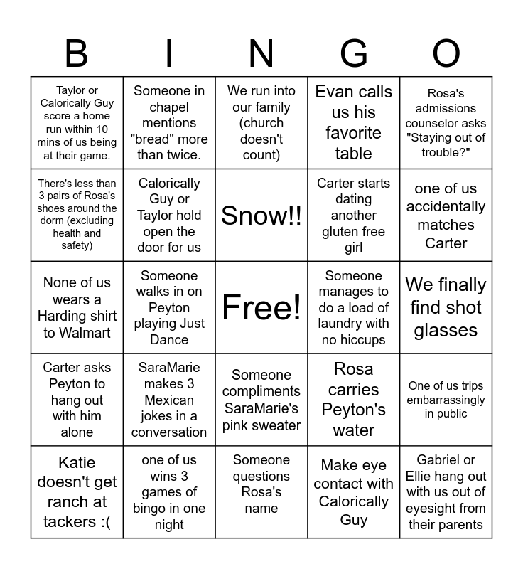This bingo card has a free space and 34 words: Have an awkward interaction with Grant, Make eye contact with Calorically Guy, See creepy Starbucks guy, Make eye contact with Pretty-Eyed friend, Carter asks Peyton to hang out with him alone, Calorically Guy or Taylor hold open the door for us, Rosa's admissions counselor asks "Staying out of trouble?", Katie doesn't get ranch at tackers :(, Someone in chapel mentions "bread" more than twice., Carter makes a dirty joke, Snow!!, We run into our family (church doesn't count), Someone looks in our window very obviously, Peyton wears sweatpants (inside ofc), Someone manages to do a load of laundry with no hiccups, one of us accidentally matches Carter, one of us wins 3 games of bingo in one night, None of us wears a Harding shirt to Walmart, SaraMarie makes 3 Mexican jokes in a conversation, Rosa carries Peyton's water, Someone compliments SaraMarie's pink sweater, Edwin doesn't recognize us, Taylor or Calorically Guy score a home run within 10 mins of us being at their game., We finally find shot glasses, Someone questions Rosa's name, Gabriel or Ellie hang out with us out of eyesight from their parents, Evan calls us his favorite table, Mr. Chance tries to set Katie up with someone, Carter starts dating another gluten free girl, There's less than 3 pairs of Rosa's shoes around the dorm (excluding health and safety), We invite a new friend somewhere (dinner, activity), Someone walks in on Peyton playing Just Dance, One of us trips embarrassingly in public and Rosa wins first place in Just Dance.