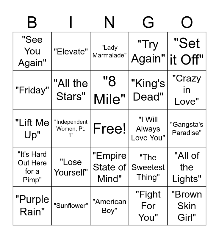 This bingo card has a free space and 24 words: "Lose Yourself", "Sunflower", "8 Mile", "Purple Rain", "Set it Off", "See You Again", "Friday", "Elevate", "I Will Always Love You", "Empire State of Mind", "King's Dead", "Lift Me Up", "The Sweetest Thing", "All of the Lights", "All the Stars", "Fight For You", "Gangsta's Paradise", "Lady Marmalade", "Crazy in Love", "Independent Women, Pt. 1", "Brown Skin Girl", "It's Hard Out Here for a Pimp", "Try Again" and "American Boy".
