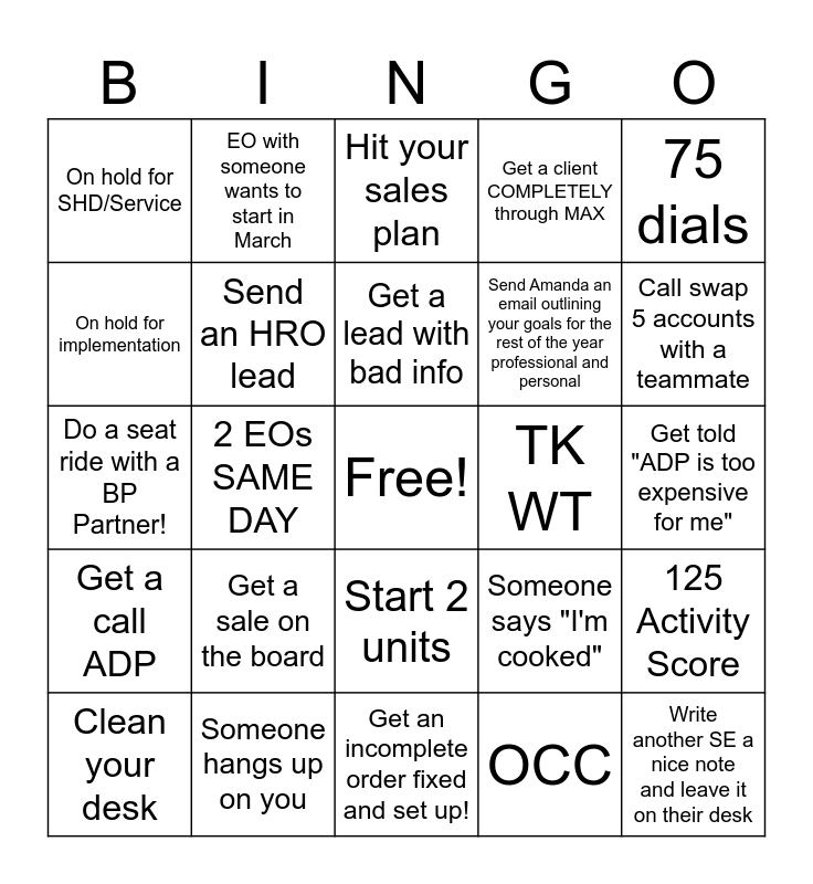 This bingo card has a free space and 32 words: OCC, SEND 2 BP LEADS SAME DAY, 2 EOs SAME DAY, Hit your starts plan, Get a call ADP, Send an HRO lead, 75 dials, 125 Activity Score, EO with someone wants to start in March, Get a lead for someone looking for W-2 info, Get a lead with bad info, Hit your sales plan, RS WT, WC WT, TK WT, Send Amanda a gong call with notes on what you could have done better!, Clean your desk, Do a seat ride with a BP Partner!, Start 2 units, Get a sale on the board, Someone says "I'm cooked", Listen to a teammate's gong call and give feedback + tag Amanda, Get told "ADP is too expensive for me", Someone hangs up on you, Write another SE a nice note and leave it on their desk, Get a client COMPLETELY through MAX, Send Amanda an email outlining your goals for the rest of the year professional and personal, On hold for implementation, On hold for SHD/Service, Get an incomplete order fixed and set up!, Do a dance routine during huddle and Call swap 5 accounts with a teammate.
