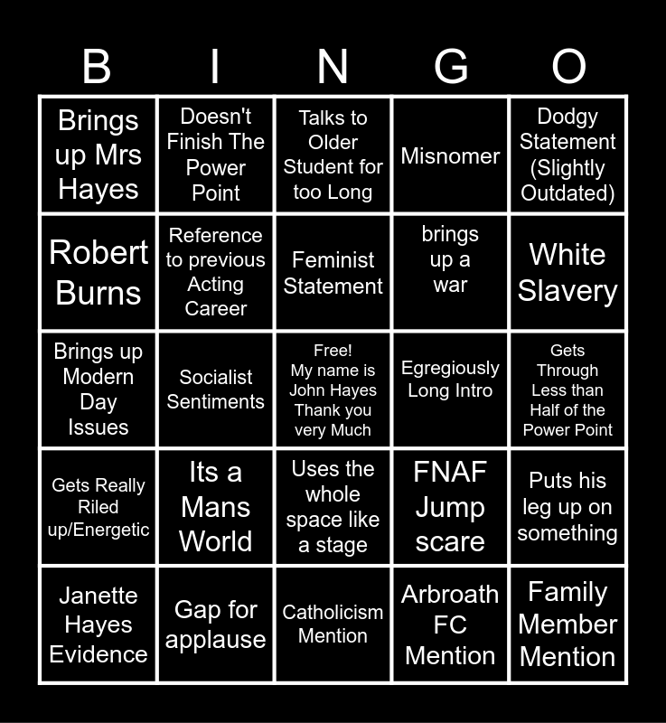 This bingo card has a free space and 24 words: Its a Mans World, Gap for applause, Feminist Statement, Janette Hayes Evidence, Dodgy Statement (Slightly Outdated), Brings up Mrs Hayes, Robert Burns, Doesn't Finish The Power Point, Egregiously Long Intro, Uses the whole space like a stage, brings up a war, Brings up Modern Day Issues, FNAF Jump scare, Puts his leg up on something, Reference to previous Acting Career, Arbroath FC Mention, Gets Through Less than Half of the Power Point, Talks to Older Student for too Long, White Slavery, Socialist Sentiments, Family Member Mention, Gets Really Riled up/Energetic, Misnomer and Catholicism Mention.