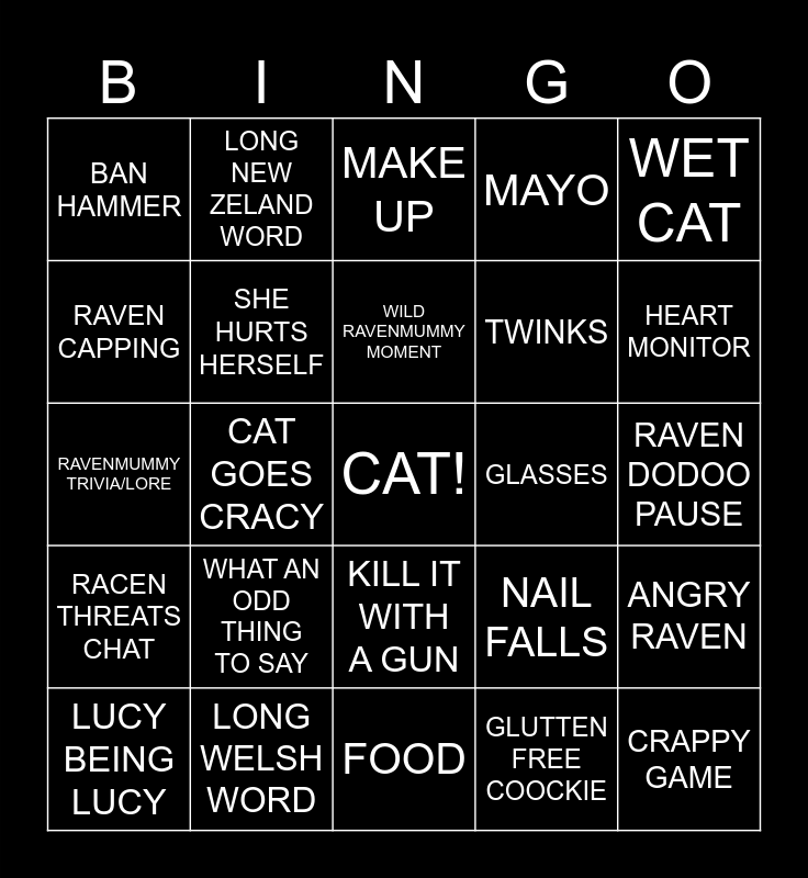 This bingo card has a free space and 24 words: WHAT AN ODD THING TO SAY, LONG WELSH WORD, WILD RAVENMUMMY MOMENT, LUCY BEING LUCY, WET CAT, BAN HAMMER, RAVEN CAPPING, LONG NEW ZELAND WORD, GLASSES, KILL IT WITH A GUN, TWINKS, RAVENMUMMY TRIVIA/LORE, NAIL FALLS, ANGRY RAVEN, SHE HURTS HERSELF, GLUTTEN FREE COOCKIE, RAVEN DODOO PAUSE, MAKE UP, HEART MONITOR, CAT GOES CRACY, CRAPPY GAME, RACEN THREATS CHAT, MAYO and FOOD.