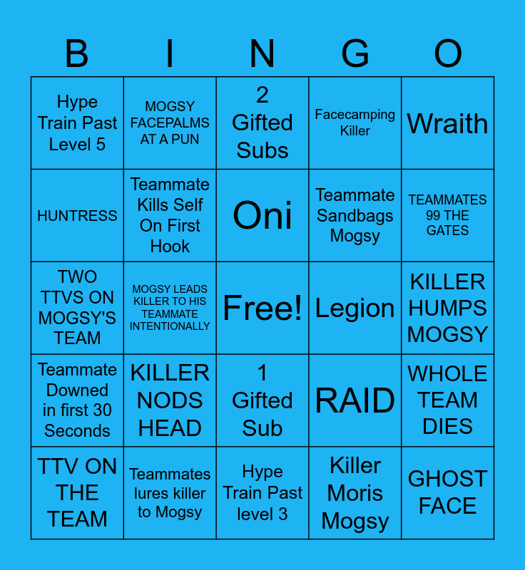 This bingo card has a free space and 60 words: Survivor D/Cs, Teammates lures killer to Mogsy, God Pallet Wasted, Teammate Downed in first 30 Seconds, Killer Moris Mogsy, Tunneled off First Hook, Teammate Kills Self On First Hook, Hype Train LVL 5, Teammate Sandbags Mogsy, Killer Finds Mogsy First, Facecamping Killer, NURSE, HUNTRESS, TRAPPER, WESKER, Hype Train Past Level 5, GHOST FACE, Wraith, HILLBILLY, Oni, Legion, 2 Gifted Subs, TTV ON THE TEAM, WHOLE TEAM DIES, MOGSY DIES FIRST, Only Mogsy Escapes, MOGSY RUNS INTO A WALL, SARAH ENTERS THE ROOM, TEAMMATES 99 THE GATES, FIND A BROWN TOOLBOX IN CHEST, MOGSY GETS HATCH ESCAPE, SPIRIT, MOGSY FAILS SKILLCHECK WITH ANOTHER TEAMMATE ON GEN, 4 or More SURVIVORS ESCAPE, MOGSY FACEPALMS AT A PUN, MOGSY TAKES A BATHROOM BREAK, MOGSY GETS SLUGGED, MOGSY LEADS KILLER TO HIS TEAMMATE INTENTIONALLY, MOGSY FAILS TO STUN KILLER WITH PALLET, TWO TTVS ON MOGSY'S TEAM, MOGSY TEABAGS, KILLER NODS HEAD, KILLER HUMPS MOGSY, MOGSY TEABAGS AND THEN IMMEDIATELY GETS DOWNED, RAID, 5 Gifted Subs, 2 Gifted Subs, 500 Bits, 100 Bits, 1 Gifted Sub, Hype Train Past level 3, Blight, Mogsy Sandbags His Teammate, Mogsy says You've Falled For My Trap Card, Resub, Springtrap, Krasue, Ghoul, Ad Break and Mogsy Gets Jumpscaed.