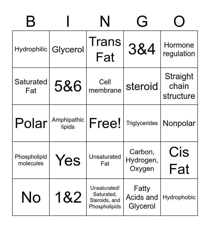 This bingo card has a free space and 24 words: No, Yes, Cell membrane, Fatty Acids and Glycerol, Hormone regulation, Hydrophilic, Glycerol, Trans Fat, Triglycerides, Nonpolar, Polar, 5&6, Carbon, Hydrogen, Oxygen, Cis Fat, Saturated Fat, 1&2, Unsaturated/ Saturated, Steroids, and Phospholipids, 3&4, Straight chain structure, Phospholipid molecules, Amphipathic lipids, Unsaturated Fat, steroid and Hydrophobic.