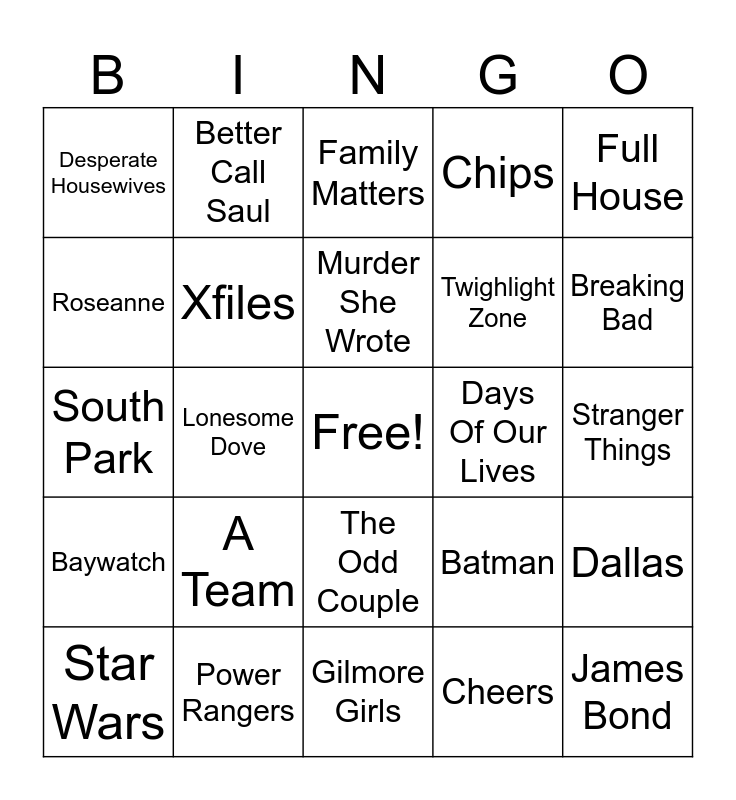 This bingo card has a free space and 45 words: Mission Impossible, James Bond, Indiana Jones, Star Wars, The Office, Cheers, Family Matters, Friends, Full House, Power Rangers, Chips, Days Of Our Lives, The Odd Couple, A Team, M*A*S*H, Gilmore Girls, Family Guy, South Park, Home Improvement, Breaking Bad, Better Call Saul, Mad Men, Game Of Thrones, Desperate Housewives, Twin Peaks, Stranger Things, The Simpsons, The Addams Family, Batman, Baywatch, Beverly Hills 90210, Dallas, Doctor Who, Hercules, Knight Rider, Lonesome Dove, Little House On The Prairie, Magnum, P.I., Miami Vice, Murder She Wrote, Roseanne, Twighlight Zone, Xena, Xfiles and Beverly Hillbillies.