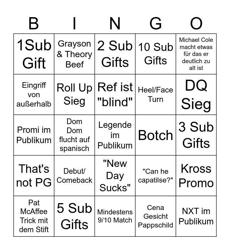 This bingo card has a free space and 24 words: Pat McAffee Trick mit dem Stift, Debut/ Comeback, Ref ist "blind", Cena Gesicht Pappschild, Michael Cole macht etwas für das er deutlich zu alt ist, 1Sub Gift, Grayson & Theory Beef, 2 Sub Gifts, Botch, 3 Sub Gifts, Promi im Publikum, Roll Up Sieg, "Can he capatilse?", Kross Promo, Eingriff von außerhalb, 5 Sub Gifts, Mindestens 9/10 Match, 10 Sub Gifts, DQ Sieg, That's not PG, Dom Dom flucht auf spanisch, "New Day Sucks", Heel/Face Turn and NXT im Publikum.