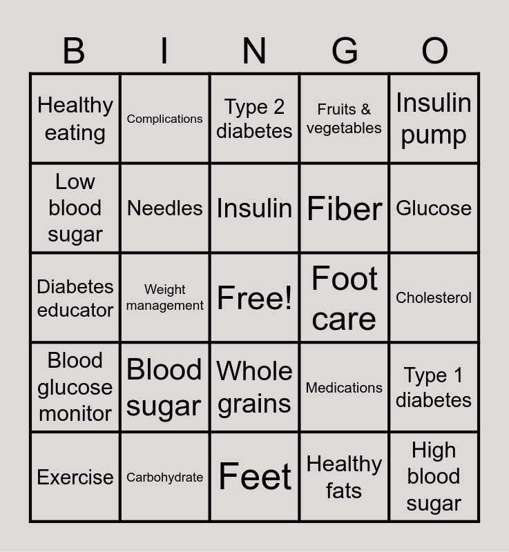 This bingo card has a free space and 24 words: Blood sugar, Carbohydrate, Insulin, Exercise, Insulin pump, Healthy eating, Low blood sugar, Complications, Foot care, Whole grains, Fiber, Diabetes educator, Medications, Type 1 diabetes, Needles, Healthy fats, Cholesterol, Type 2 diabetes, Glucose, Weight management, High blood sugar, Blood glucose monitor, Fruits & vegetables and Feet.