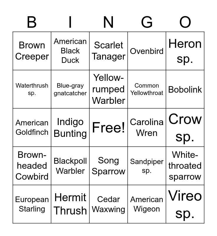 This bingo card has a free space and 84 words: American Robin, Northern Cardinal, Scarlet Tanager, Nuthatch sp., Hooded Merganser, Common Merganser, Bufflehead, Goldeneye sp., Brown Thrasher, Eastern Bluebird, Gray Catbird, Northern Mockingbird, Blue-gray gnatcatcher, Carolina Wren, House Wren, Brown Creeper, European Starling, Waterthrush sp., Blue-winged Warbler, Black and White Warbler, Nashville Warbler, Common Yellowthroat, Vireo sp., Palm warbler, Indigo Bunting, Rose-breasted Grosbeak, Chestnut-sided Warbler, Blackburnian Warbler, Black-throated Blue Warbler, Veery, Blackpoll Warbler, Purple/house finch, Chipping Sparrow, American Goldfinch, Field Sparrow, Flycatcher sp., Cedar Waxwing, American Kestrel, Bobolink, Brown-headed Cowbird, Canada Warbler, Baltimore Oriole, Tern sp., Swallow sp., Mallard, Northern Shoveler, American Black Duck, Gadwall, Killdeer, Yellowlegs sp., Plover sp., Sandpiper sp., Ovenbird, House Sparrow, Woodpecker sp., Wood Thrush, Hermit Thrush, Yellow-rumped Warbler, Common Raven, Crow sp., Blue Jay, Red-tailed Hawk, Cooper's Hawk, Herring Gull, Laughing Gull, Ring-billed Gull, Common Loon, Egret sp., Heron sp., Loon sp., White-throated sparrow, Tree Sparrow, Dark-eyed Junco, White crowned Sparrow, Song Sparrow, American Wigeon, American Black Duck, Tufted Titmouse, Black-capped Chickadee, Chimney Swift, Bald Eagle, Owl sp., Kinglet sp. and Goose sp..