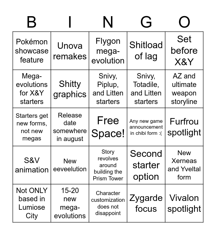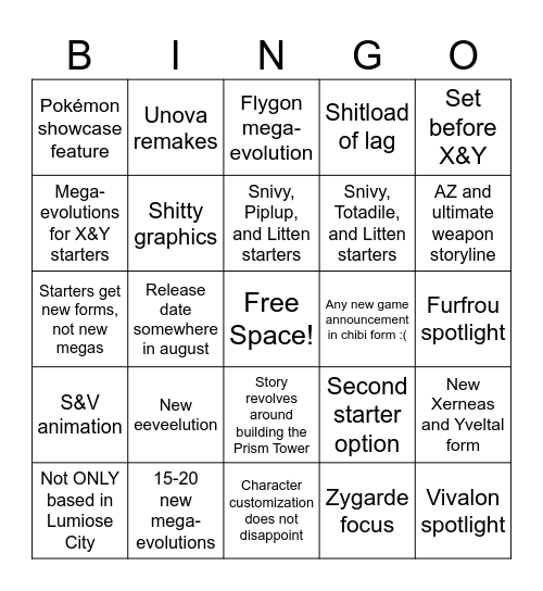 This bingo card has a free space and 24 words: New eeveelution, 15-20 new mega-evolutions, Snivy, Piplup, and Litten starters, Not ONLY based in Lumiose City, Set before X&Y, Pokémon showcase feature, Mega-evolutions for X&Y starters, Unova remakes, Any new game announcement in chibi form :(, Story revolves around building the Prism Tower, Snivy, Totadile, and Litten starters, Starters get new forms, not new megas, Second starter option, New Xerneas and Yveltal form, Shitty graphics, Zygarde focus, Furfrou spotlight, Flygon mega-evolution, AZ and ultimate weapon storyline, Release date somewhere in august, Vivalon spotlight, S&V animation, Shitload of lag and Character customization does not disappoint.