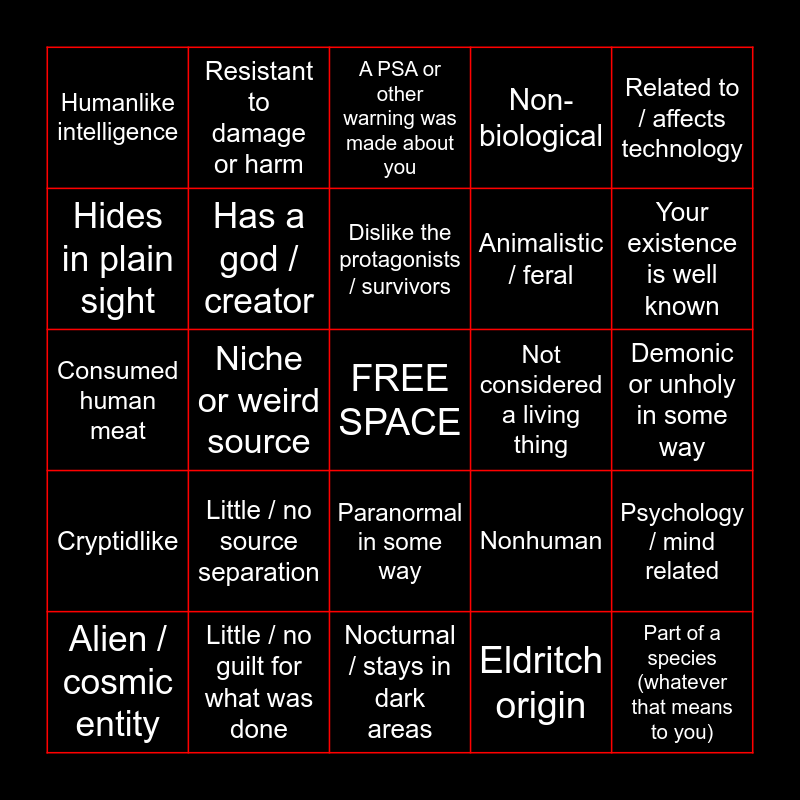 This bingo card has a free space and 24 words: Little / no source separation, Little / no guilt for what was done, Dislike the protagonists / survivors, Alien / cosmic entity, Related to / affects technology, Humanlike intelligence, Hides in plain sight, Resistant to damage or harm, Not considered a living thing, Paranormal in some way, Animalistic / feral, Consumed human meat, Nonhuman, Psychology / mind related, Has a god / creator, Eldritch origin, Demonic or unholy in some way, A PSA or other warning was made about you, Your existence is well known, Niche or weird source, Part of a species (whatever that means to you), Cryptidlike, Non-biological and Nocturnal / stays in dark areas.