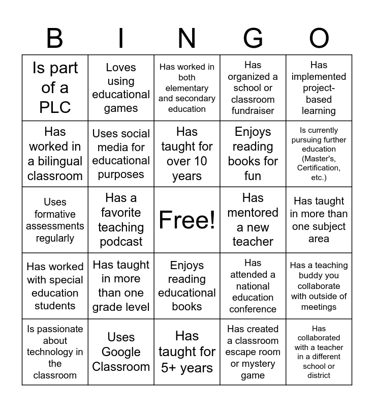 This bingo card has a free space and 24 words: Has taught in more than one grade level, Uses Google Classroom, Has taught for over 10 years, Is passionate about technology in the classroom, Has implemented project-based learning, Is part of a PLC, Has worked in a bilingual classroom, Loves using educational games, Has mentored a new teacher, Enjoys reading educational books, Enjoys reading books for fun, Uses formative assessments regularly, Has attended a national education conference, Has a teaching buddy you collaborate with outside of meetings, Uses social media for educational purposes, Has created a classroom escape room or mystery game, Has taught in more than one subject area, Has worked in both elementary and secondary education, Is currently pursuing further education (Master's, Certification, etc.), Has a favorite teaching podcast, Has collaborated with a teacher in a different school or district, Has worked with special education students, Has organized a school or classroom fundraiser and Has taught for 5+ years.