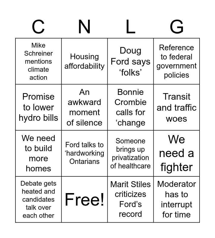This bingo card has 21 words: Free!, Cost of living crisis, Housing affordability, Greenbelt scandal, Marit Stiles criticizes Ford’s record, Bonnie Crombie calls for ‘change, Mike Schreiner mentions climate action, Doug Ford says ‘folks’, Someone brings up privatization of healthcare, Transit and traffic woes, We need to build more homes, Reference to federal government policies, Moderator has to interrupt for time, Ford talks about job creation, An awkward moment of silence, We are the only party that…, Debate gets heated and candidates talk over each other, Ford talks to ‘hardworking Ontarians, Promise to lower hydro bills, We need a fighter and Not on your side.
