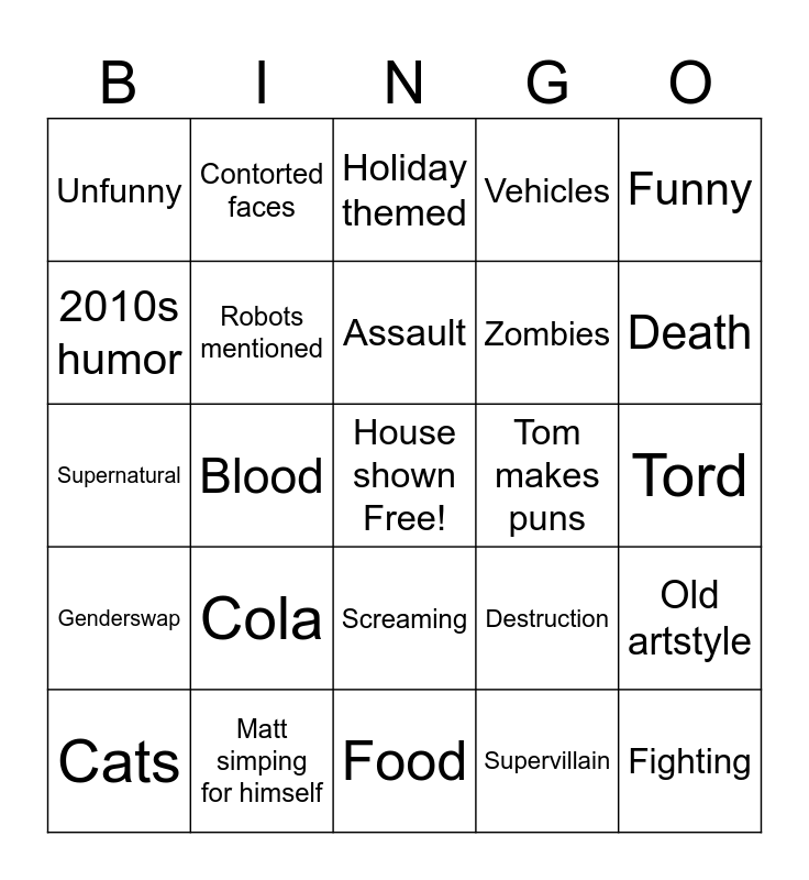 This bingo card has a free space and 24 words: Cola, Matt simping for himself, Assault, Cats, Funny, Unfunny, 2010s humor, Contorted faces, Tom makes puns, Screaming, Zombies, Supernatural, Destruction, Old artstyle, Robots mentioned, Supervillain, Tord, Holiday themed, Death, Blood, Fighting, Genderswap, Vehicles and Food.