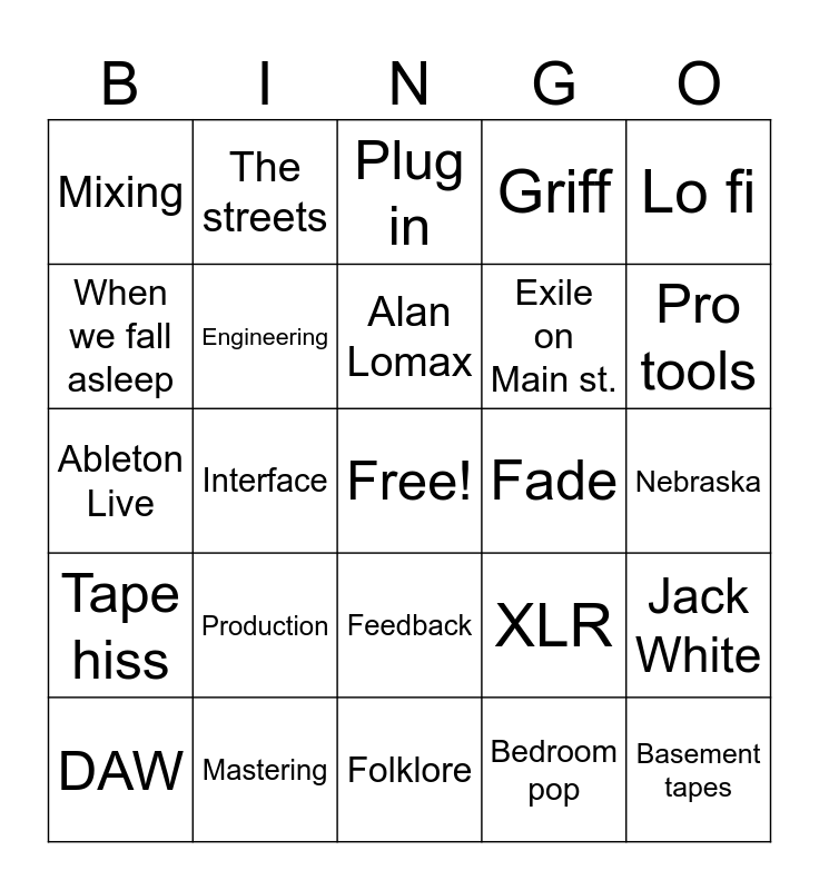 This bingo card has a free space and 29 words: DAW, Microphone, Interface, Amplifier, Mixing, Plug in, Engineering, Production, Fade, Mastering, Nebraska, Basement tapes, Folklore, Bedroom pop, Pro tools, Garageband, Feedback, Tape hiss, Lo fi, Ableton Live, XLR, 1/4 inch, Exile on Main st., When we fall asleep, Griff, The streets, Jack White, Alan Lomax and Lorde.